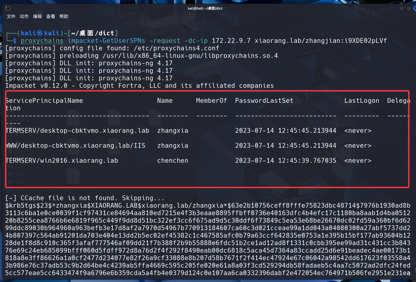 已经确认了 zhangxia 和 chenchen 这两个用户账户是可以被“Kerberoast”的。