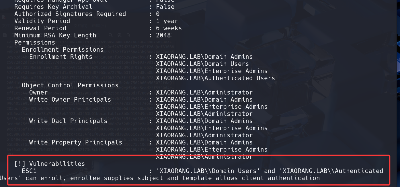 查看用户的证书情况:(这行命令是在执行一次针对 Active Directory 证书服务 (AD CS) 的安全审计和漏洞发现。)